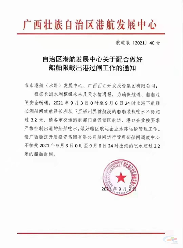 9月2日,廣西壯族自治區港航發展中心發布《自治區港航發展中心關于配合做好船舶限載出港過閘工作的通知》,稱,根據長洲水利樞紐未來幾天水情通報,為確保航道、船舶過閘安全暢通,2021年9月3日0時至9月6日24時出港下航經長洲船閘或航經長洲壩下至梧州界首航段的船舶裝載吃水不得超過3.2米,請各市交通港航部門督促轄區航運、港口企業按要求嚴格控制出港的船舶吃水,做好轄區航運企業水路運輸管理工作。請廣西西江開發投資集團有限公司船閘運行管理部船閘調度中心不接受2021年9月3日0時至9月6日24時出港的吃水超過3.2米的船舶報到。