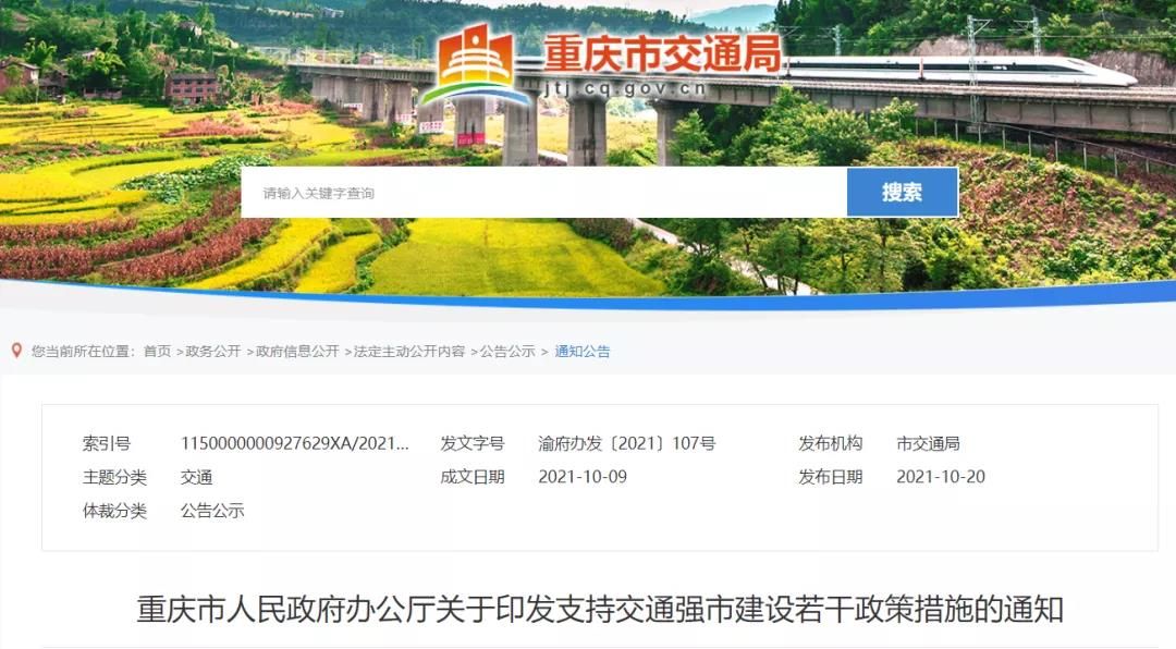 近日,重慶市印發(fā)《支持交通強市建設(shè)若干政策措施》,文件不僅明確“十四五”期間安排市級財政資金1150億元,統(tǒng)籌用于高速鐵路、高速公路、普通國省干線公路、民航、水運以及支持鄉(xiāng)村振興的農(nóng)村公路等交通基礎(chǔ)設(shè)施建設(shè)。