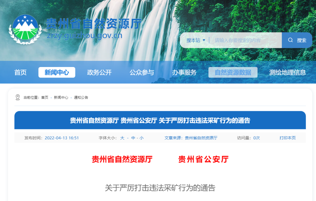獲悉,近日,貴州省自然資源廳和省公安廳聯(lián)合發(fā)布《關(guān)于嚴(yán)厲打擊違法采礦行為的通告》(以下簡(jiǎn)稱《通告》)?!锻ǜ妗繁硎緡?yán)禁任何單位或個(gè)人以任何形式非法違法盜采礦產(chǎn)資源。即日起,立即停止無證開采、以探代采、不按采礦許可證上載明的礦種、“洗洞”“洗坡”盜采金礦、超出批準(zhǔn)范圍等非法違法開采礦產(chǎn)資源行為。