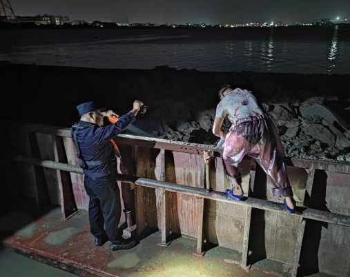 當(dāng)晚9時(shí)50分,由中山市海洋綜合執(zhí)法支隊(duì)支隊(duì)長(zhǎng)梁灶帶領(lǐng)隊(duì),一眾聯(lián)合執(zhí)法人員從橫門(mén)漁港出發(fā)開(kāi)始突擊巡查。當(dāng)巡查至洪奇瀝沙仔碼頭至屎船沙海域時(shí),發(fā)現(xiàn)1艘抓斗式采砂船“粵新會(huì)工8179”正在作業(yè)。執(zhí)法人員立即靠近準(zhǔn)備登船檢查,該采砂船見(jiàn)執(zhí)法船艇靠近馬上停止作業(yè)并關(guān)閉照明設(shè)備,意圖逃避查處。執(zhí)法人員迅速登船查看,發(fā)現(xiàn)該采砂船及系泊的“粵清遠(yuǎn)貨3390”運(yùn)泥船泥水濕潤(rùn),有明顯的采砂痕跡,運(yùn)輸船上載有泥沙混合物約200立方米,船上負(fù)責(zé)人辯稱(chēng)正在進(jìn)行航道疏浚,執(zhí)法人員要求其提供相關(guān)資料,該負(fù)責(zé)人無(wú)法提供。
